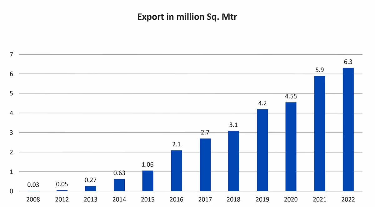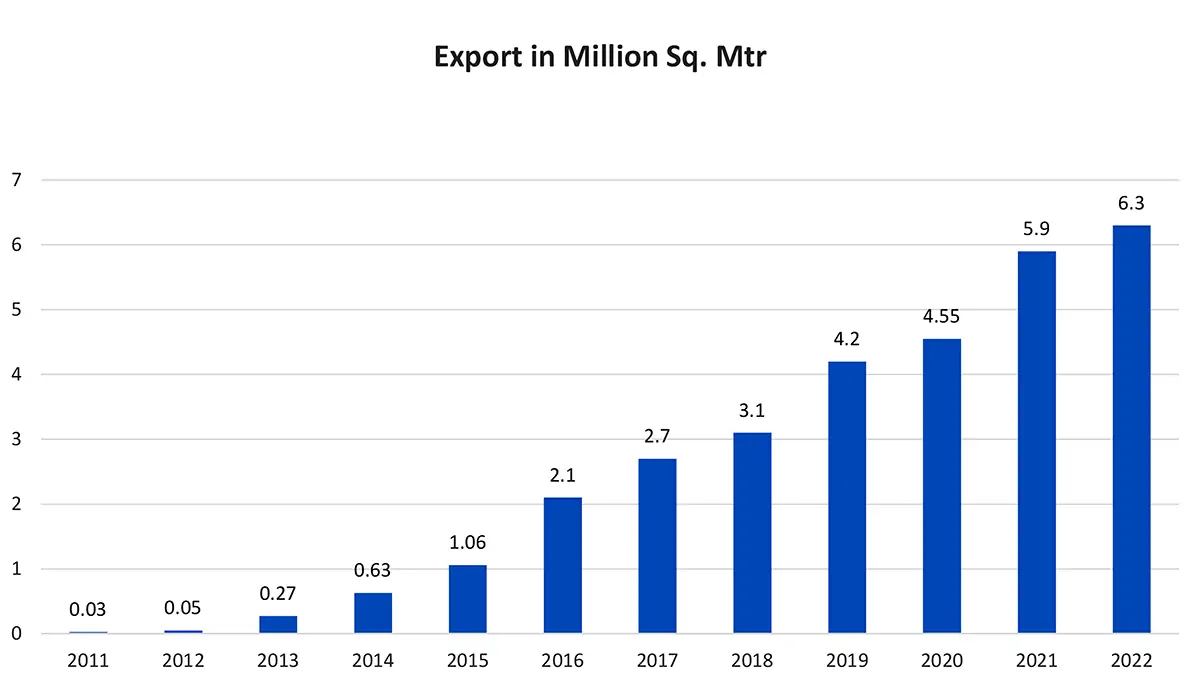 We export the choicest of our products across the world and are renowned as the best tiles exporter from India. What started as 0.3 million square meters of exports in the year 2012 has reached a massive success of 11.1 million square meters today!